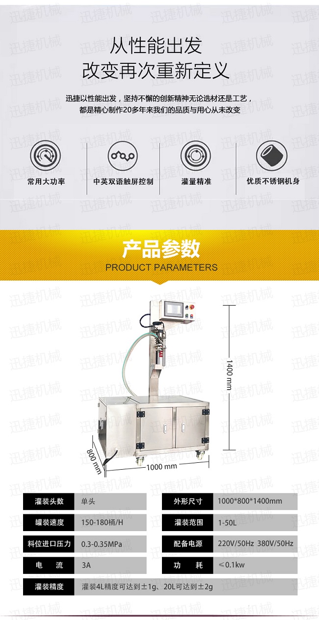1.罐裝范圍廣,本機可罐裝1-50L??蓾M足多種規(guī)格得罐裝。