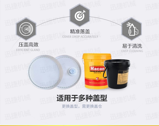人工放蓋至料倉——自動(dòng)剝離——自動(dòng)吸蓋——自動(dòng)掛蓋——自動(dòng)滾壓蓋——自動(dòng)出桶——一個(gè)循環(huán)完成。