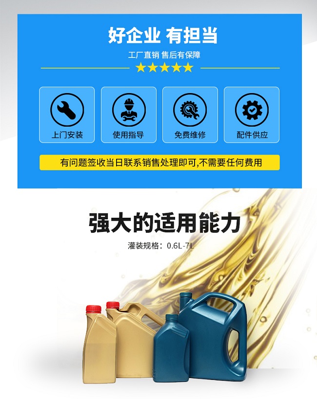 該灌裝機(jī)可以配置 高速旋蓋機(jī) 油桶貼標(biāo)機(jī) 油瓶噴碼機(jī) 油壺自動(dòng)自動(dòng)裝箱碼垛機(jī)。組成油脂灌裝包裝流水線(xiàn)。高效、節(jié)能、自動(dòng)化的設(shè)備。