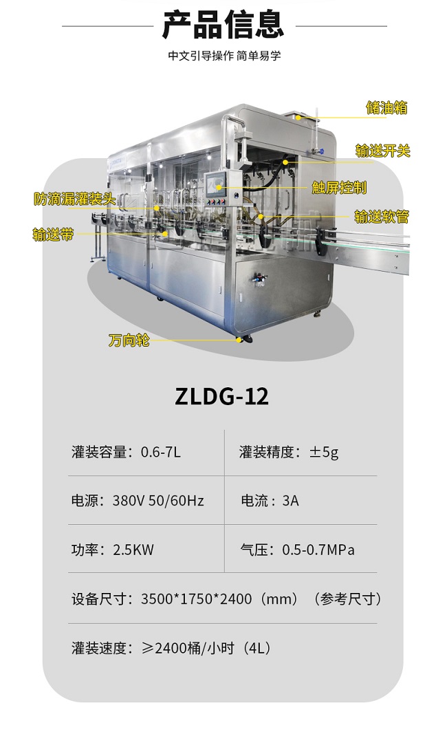 機(jī)器應(yīng)用范圍:1-10升通用型號(hào),機(jī)器采用流量計(jì)計(jì)量,觸摸屏控制,參數(shù)一鍵調(diào)整,方便快捷??梢怨嘌b各種油脂,油料。灌裝頭采用專(zhuān)用的油脂防滴漏灌裝頭,不滴漏。機(jī)器設(shè)定有快慢速技術(shù),可以先快后慢,防止物料噴濺。保持生產(chǎn)車(chē)間干凈潔凈。