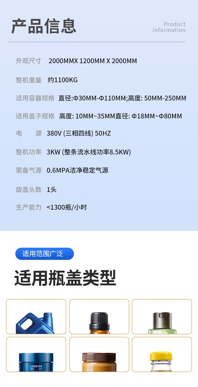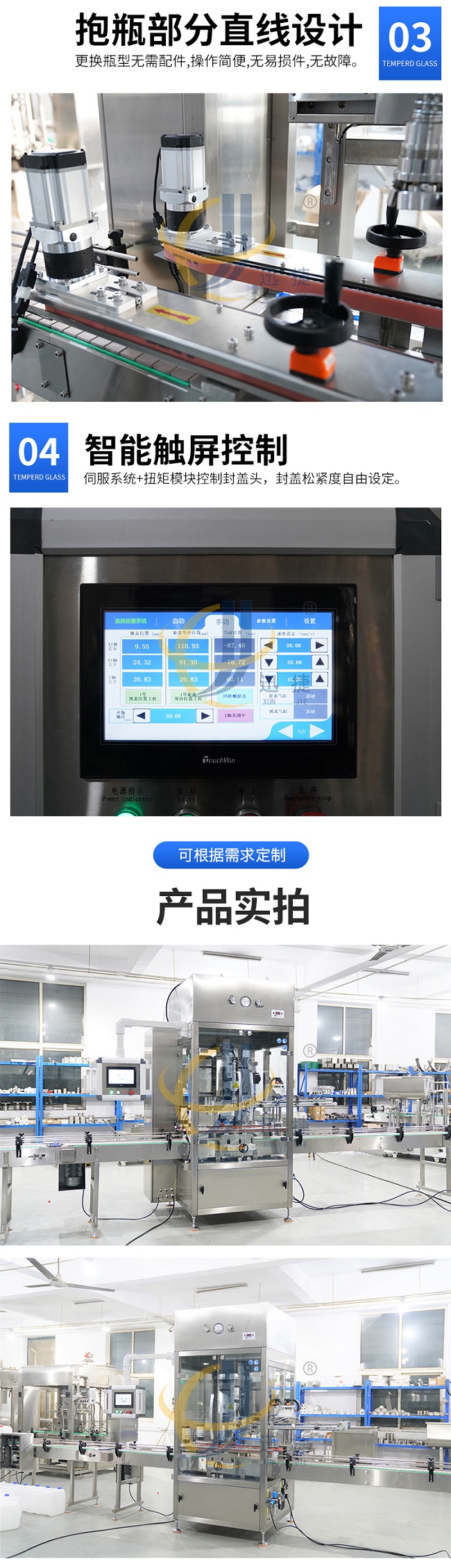 跟蹤式旋蓋機(jī)是在聯(lián)機(jī)取放旋蓋機(jī)的基礎(chǔ)上設(shè)計的,它解決了聯(lián)機(jī)拾放旋蓋機(jī)容量低的問題,其運動由運動控制器控制,比PLC更、更準(zhǔn)確,封蓋時,封蓋頭隨著瓶子的移動而移動。它可以配備一個或兩個封蓋頭,容量從 40B/M 到70B/M 無需考慮瓶子和蓋子的大小(基于 100ML到5000ML瓶子)。