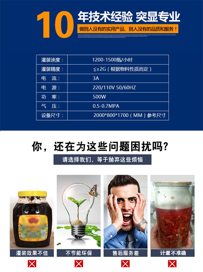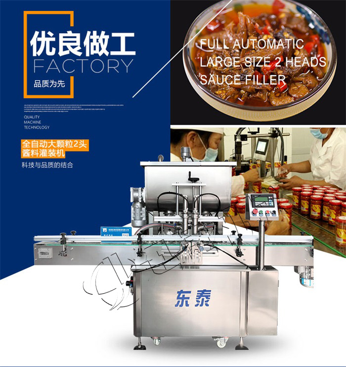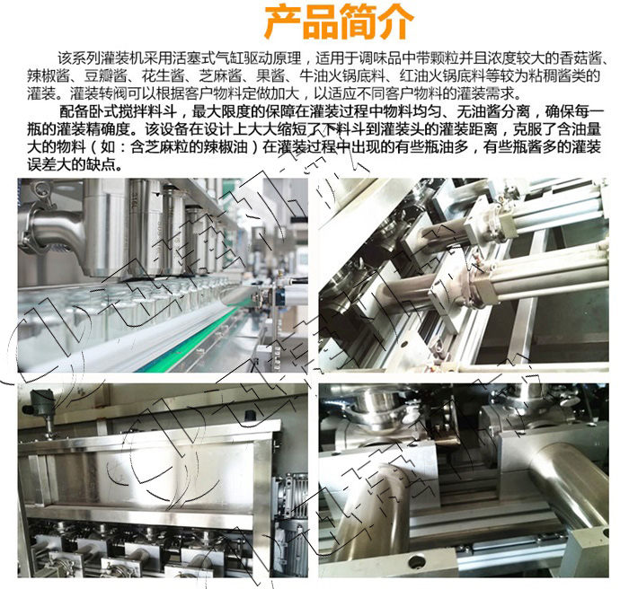 該系列灌裝機(jī)采用活塞式氣缸氣動原理,適用于調(diào)味品中帶顆粒并且濃度較大的香菇醬、辣椒醬、豆瓣醬、花生醬、芝麻醬、果醬、牛油火鍋底料、紅油火鍋底料等較為粘稠醬類的灌裝。灌裝轉(zhuǎn)閥可以很具客戶物料定做加大,以適應(yīng)不同客戶物料的灌裝需求。