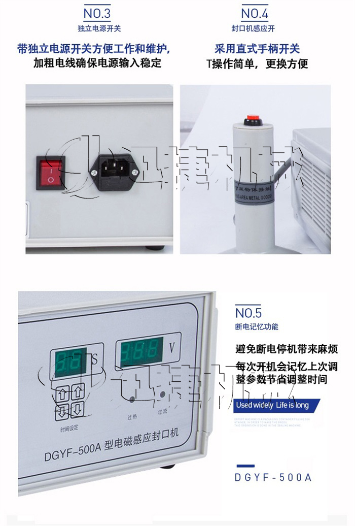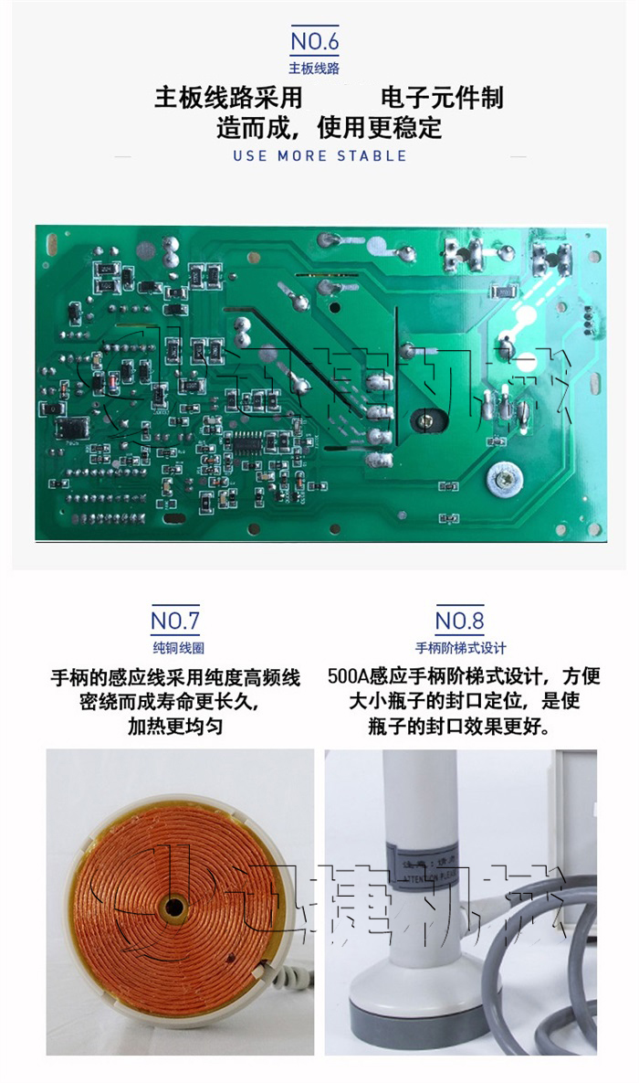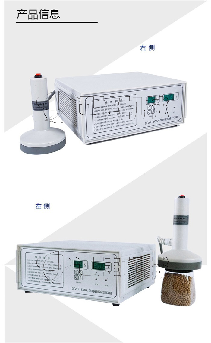 本手持式電磁感應(yīng)鋁箔封口機(jī)是利用電磁感應(yīng)的原理,將瓶口上的鋁箔片瞬間產(chǎn)生高熱,然后熔合在瓶口上,使達(dá)到封口的功能。具有良好的防潮、防霉、防偽作用,起到延長物品保存周期的目的。封口容器的材質(zhì)可以是聚乙(PE)、聚丙烯(PP)、聚酯(PET)、聚苯乙烯(PS)、ABS以及玻璃等,不能用于金屬瓶體及瓶蓋。(本公司同時(shí)提供各種材料感應(yīng)鋁箔膜)。