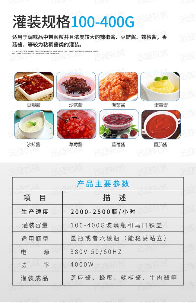 灌裝機采用活塞式灌裝原理,適用于調(diào)味品中帶顆粒并且濃度較大的辣椒醬、豆瓣醬、花生醬、香菇醬、果醬、牛油火鍋底料、紅油火鍋底料、蝦醬等較為粘稠醬類的灌裝。