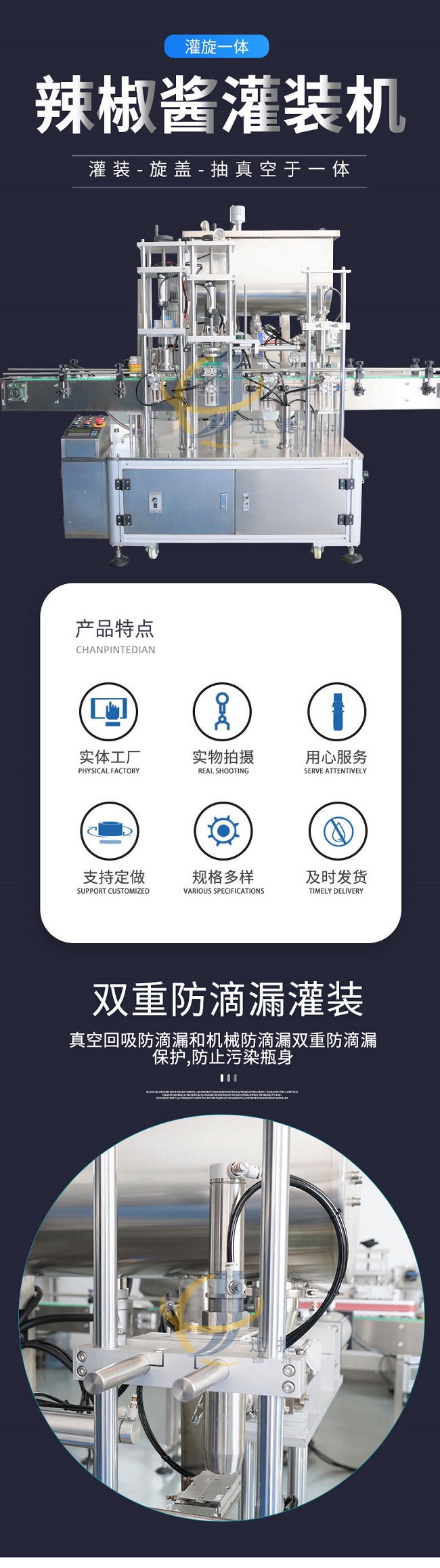 迅捷機械加工設備齊全,技術力量雄厚,選用德國PLC控制系統(tǒng)、臺灣AirTac的氣動組件和臺灣伺服的電控組件,從這幾個部件可以看的出來全自動牛肉醬灌裝機改善的不僅是質(zhì)量,生產(chǎn)效率和產(chǎn)品的外觀包裝,還會不斷的引進國際上新的科學技術,全自動牛肉醬灌裝機用更好的質(zhì)量滿足生活的需求。在自動化生產(chǎn)日漸普及的今天,全自動牛肉醬灌裝機讓企業(yè)的商品以更快的速度出現(xiàn)在市場中,畢竟一些繁雜的工作讓人工去完成的話不但麻煩,效率也不會很高,想要適應現(xiàn)代化的大規(guī)模批量生產(chǎn),就需要全自動牛肉醬灌裝機的幫助來代替人工完成這些繁雜的工作。