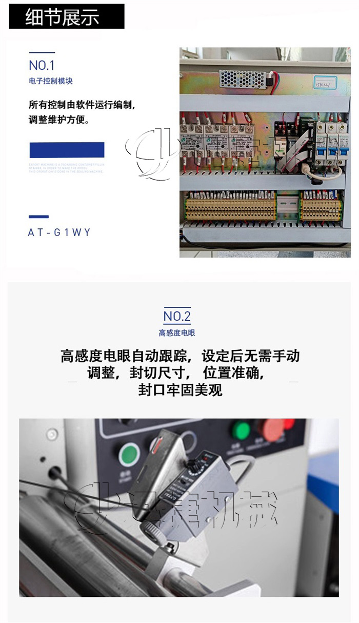 E、色標(biāo)檢測器,使色標(biāo)檢測更為準(zhǔn)確網(wǎng)紋、直紋、豎紋式封口任選。